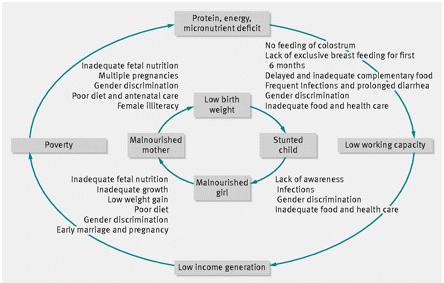 • Protein, energy, and micronutrient deficiency, affecting 30% of the population 67 • The intergenerational cycle that links undernourished adolescent girls, pregnant women, and low birthweight babies (figure) • Lack of awareness about proper nutritional norms and child and maternal care • Sex inequity throughout life, translating into lower nutritional intake for female family members, and a cultural tradition that does not promote dietary supplementation during pregnancy • Low political priority and absence of an integrated national programme with the explicit objective of reducing undernutrition.